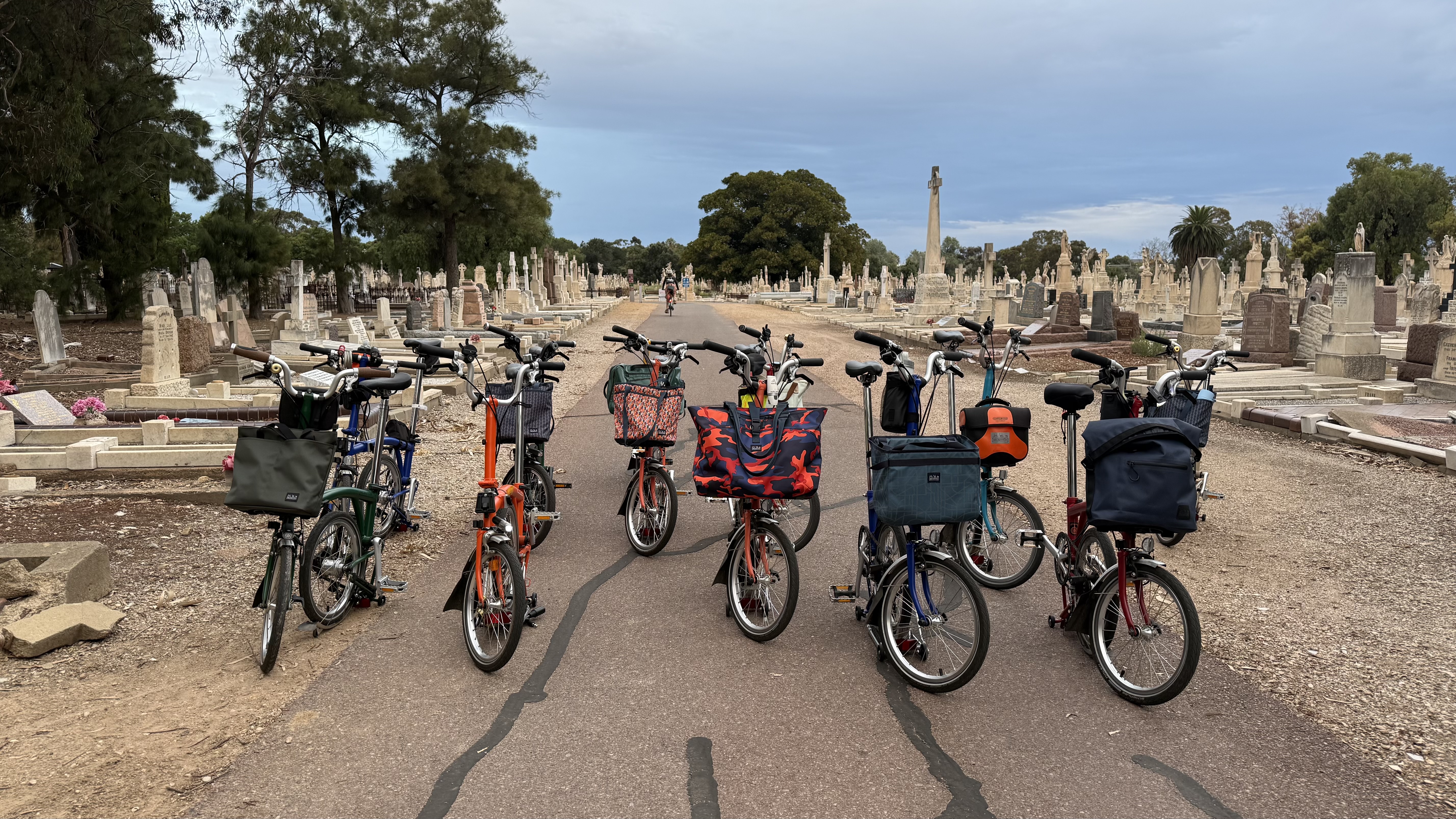 Back on the Brompton’s we avoided the traffic and quickly took a side street from the theatre, made our way through one of the new tram underpasses, and cycled along the path behind the Showgrounds, under the Greenhill Road/Anzac highway intersection to head long Anzac Highway towards the entrance of the West Terrace cemetery. The gates are usually closed from 7pm… but we were aware there are a number of Fringe events taking place within the grounds (don’t look they are all booked out).. and so thankfully we were waved through by the security guard (who is going to stop 13 Bromptoneers?). At the back of the group, where the interesting conversations occur, we were talking about cemeteries and their use – reflecting some people would find cycling/walking through uncomfortable. Its an interesting thought given 100-200 years ago people would use them as public spaces to walk through and promenade, given the lack of public spaces within society.