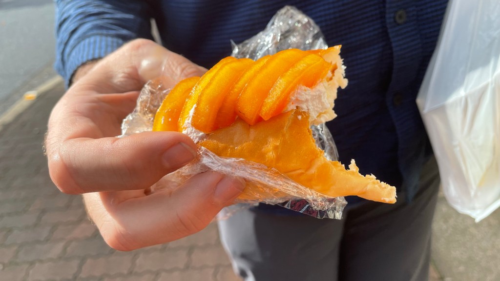 In the suburb of Hitari I enjoyed conversing with local high school students at the local market. I was surveyed about the average age of persimmon farmers in the area (67.3) and received a free persimmon sandwich as a gift. It was delightful.