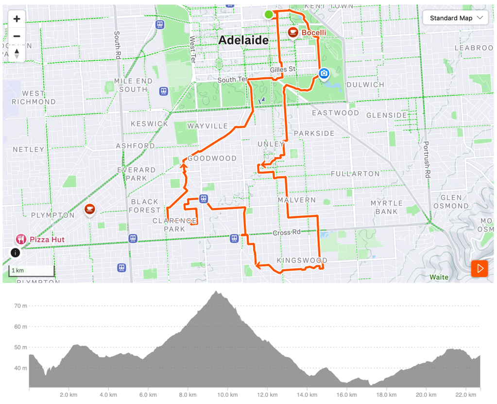 Route23km, Adelaide, Parkside, Unley, Malvern, Kingswood, Kings Park, Goodwood