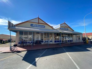 The Ardrossan Bakery is easy to locate – as it is I in the Main Street. There are a few seats outside, and over the road there are a couple of park benches under the Norfolk pines which are down the Main Street.
