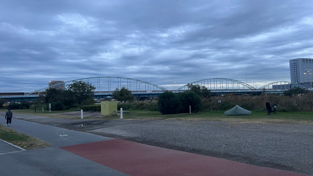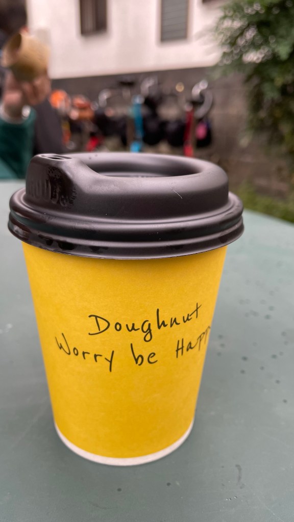 We then continued down the Tama river (same route we did on Tuesday)… which is a high embankment which enables you to see great views along the river (flood plain) and into the distance. Along the way we stopped for some coffee and doughnuts.