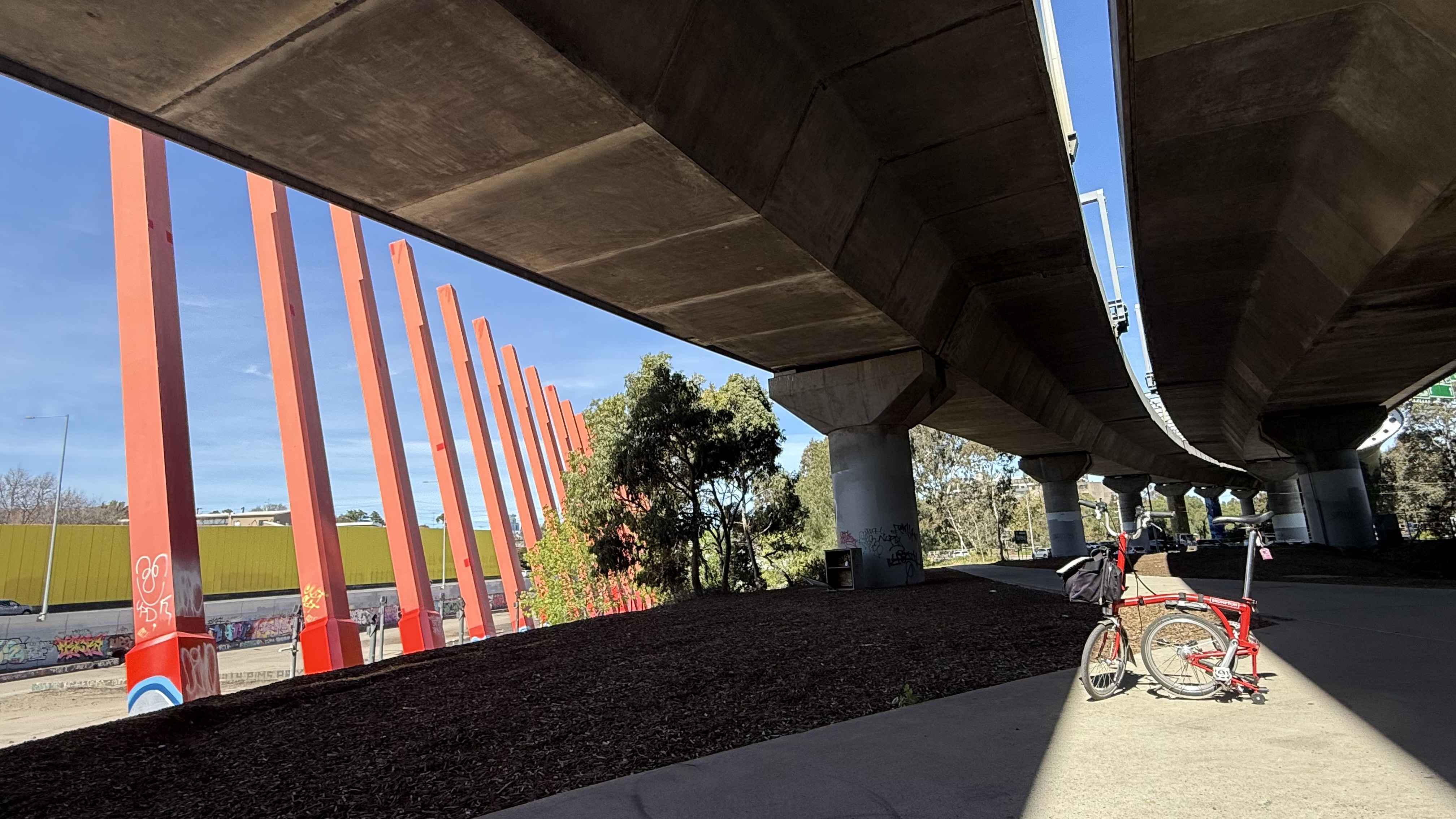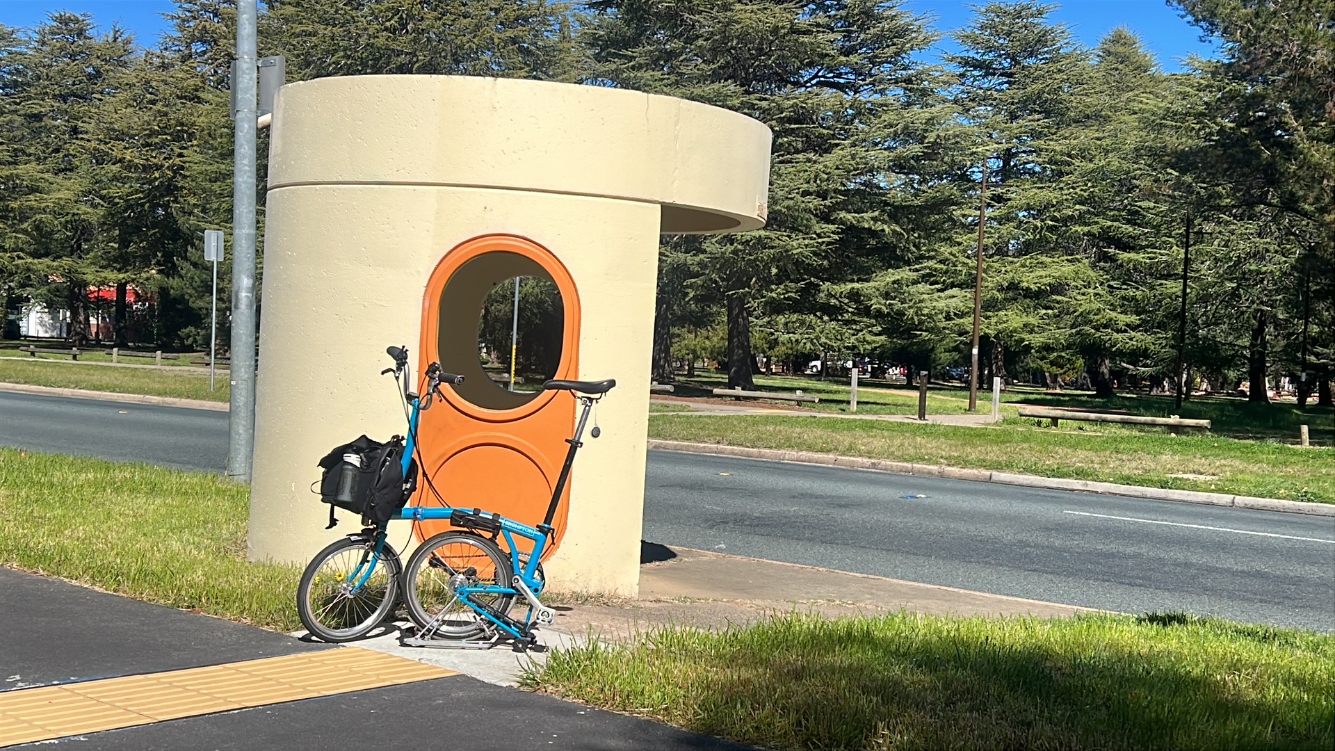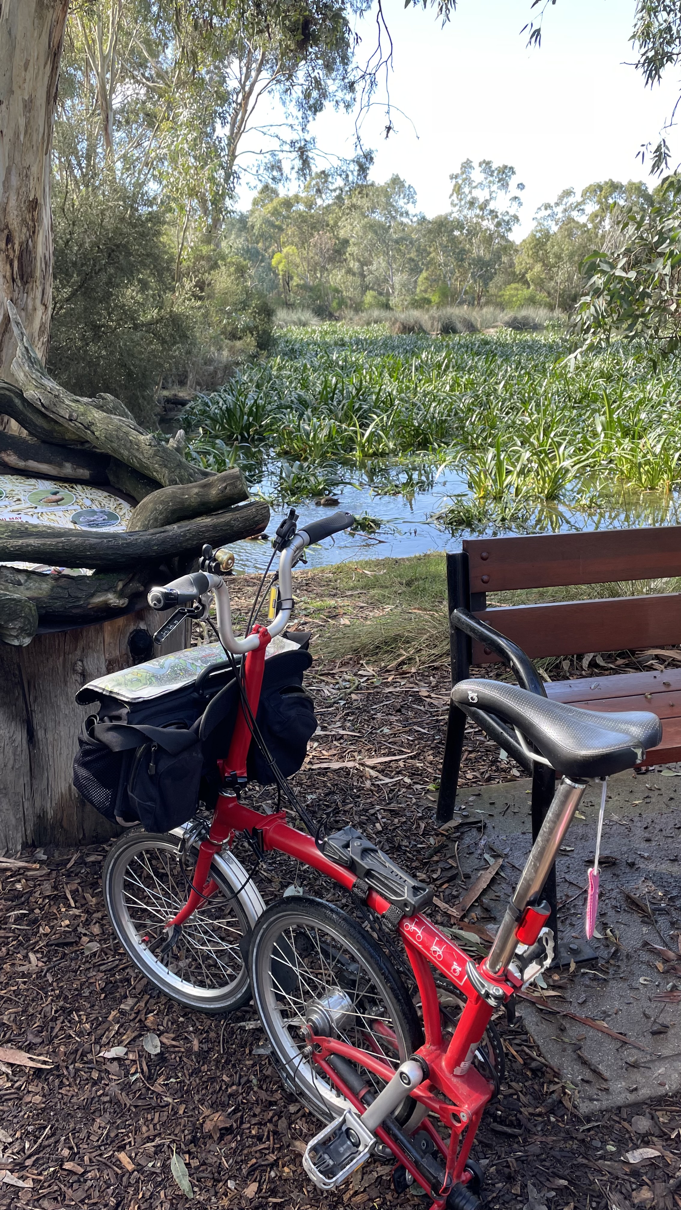 The next challenge was navigating around, and crossing the tram works, and heading to the morning tea stop. It was great to join up with Andrew and Lizzie with their cargo bike (made better with a Brompton in the cargo bay), just before the Oaklands Wetland and Reserve.