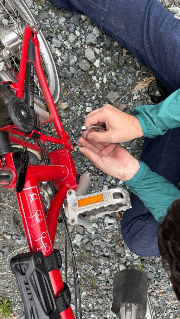 Fixing the bikeYeah! Fixed Bike – 200 metres up the road from being fixed