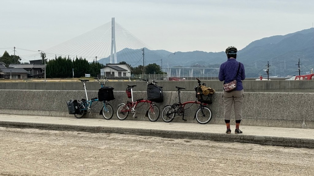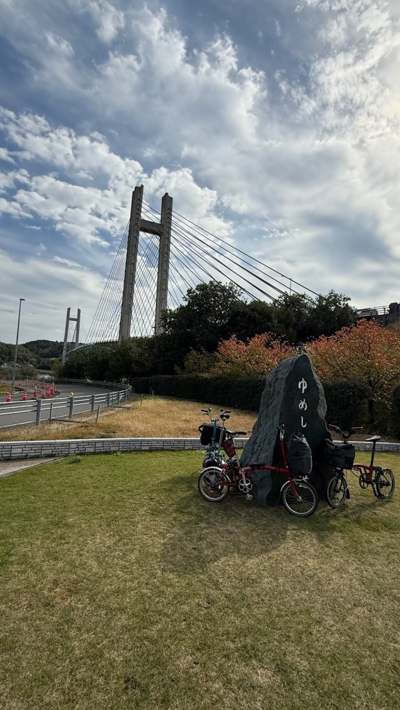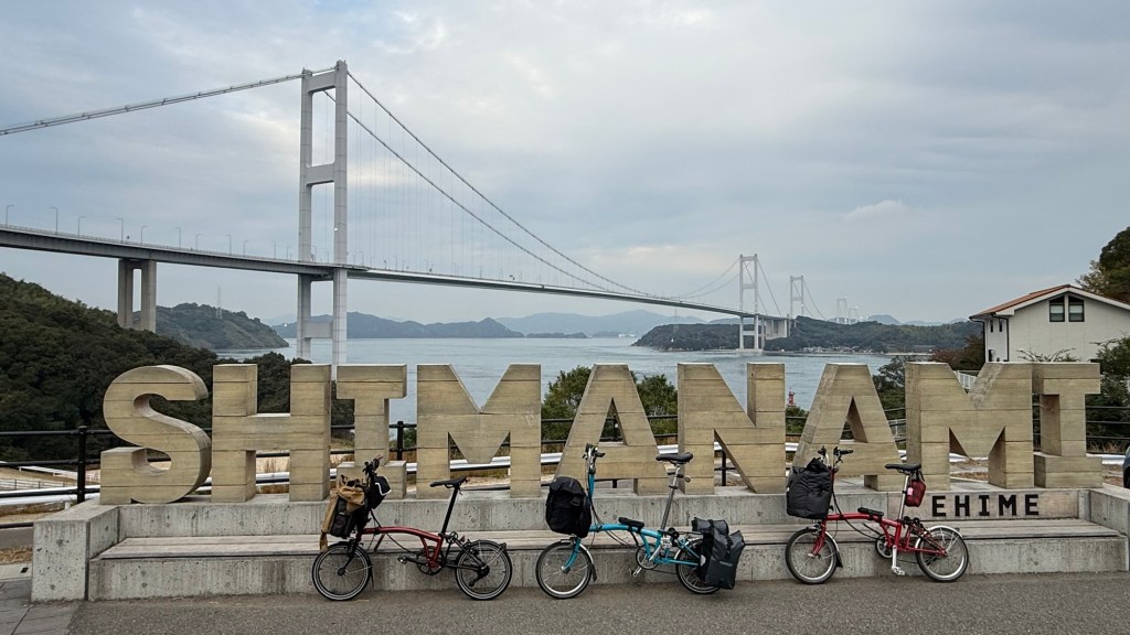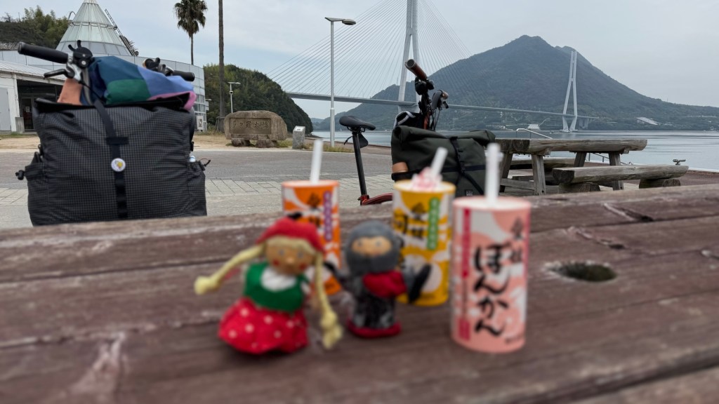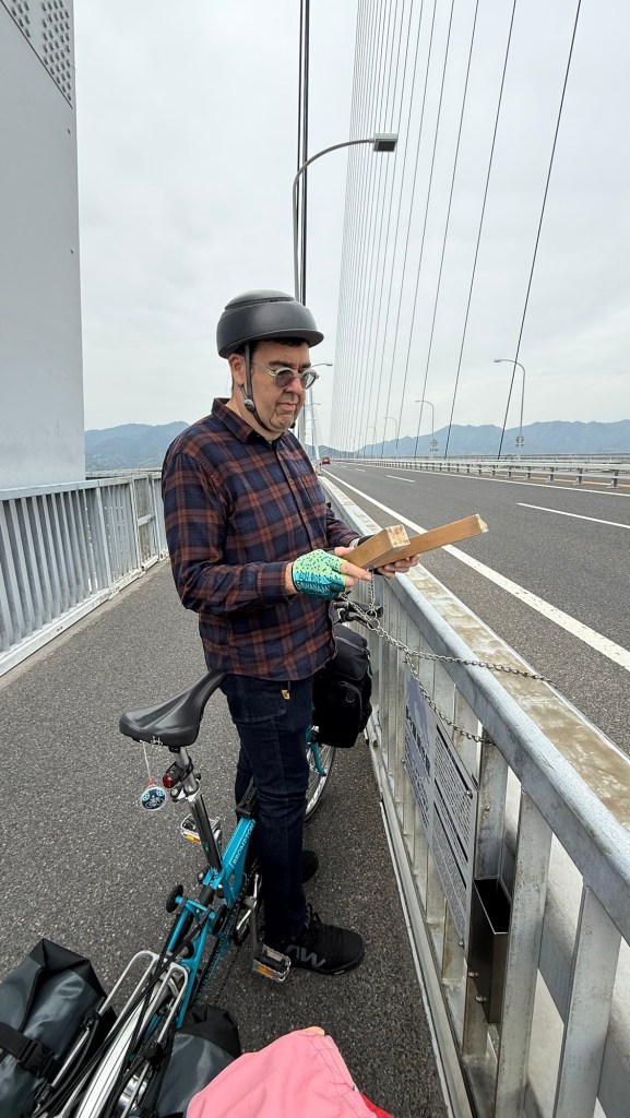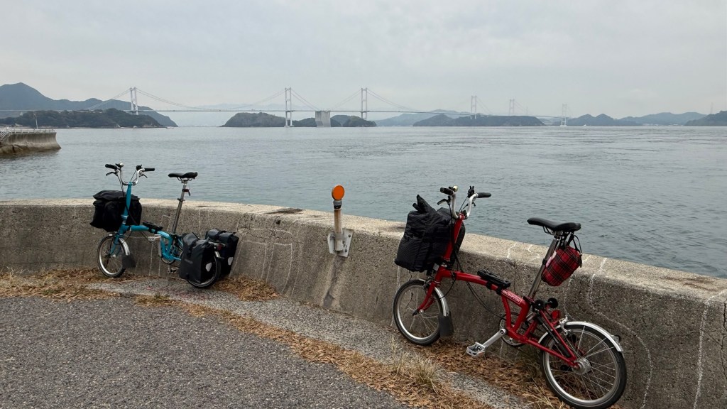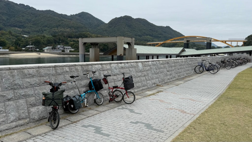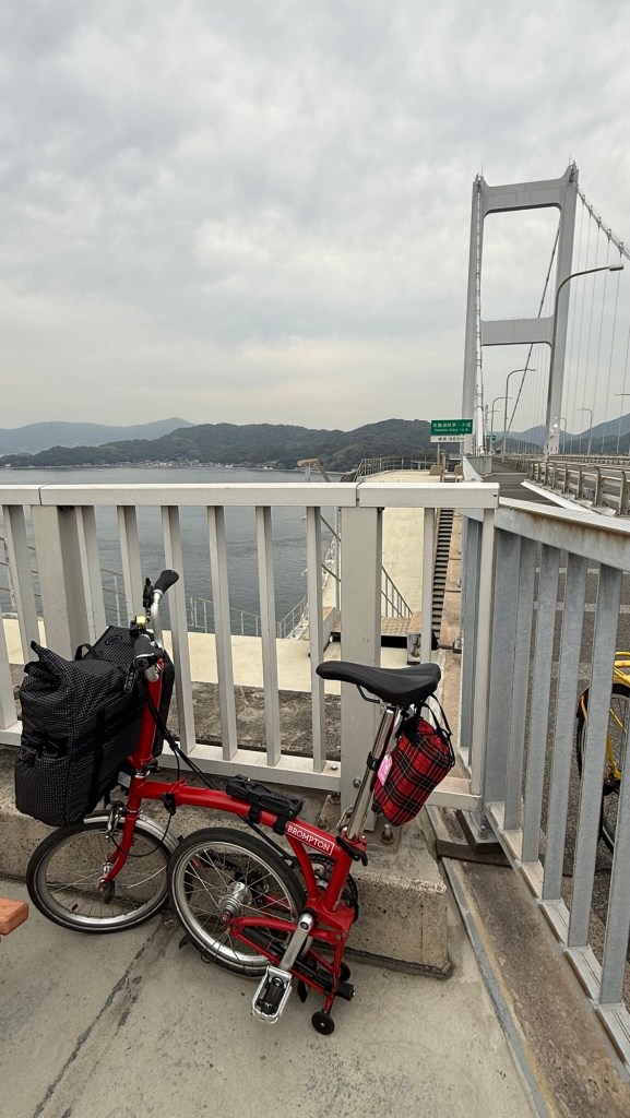 The bridges along the Shimanami Kaido are a wonderous thing. The approaching angles are really good for cyclists… even if you don’t have a battery, if you can’t cycle there is always walking. At the first lookout point of the bridge we came another Brompton rider from Korea who had cycled from Fukuoka… wow! Then we headed over the bridge, with a brief stop to scare away the dragons and on to the Ehime prefecture.