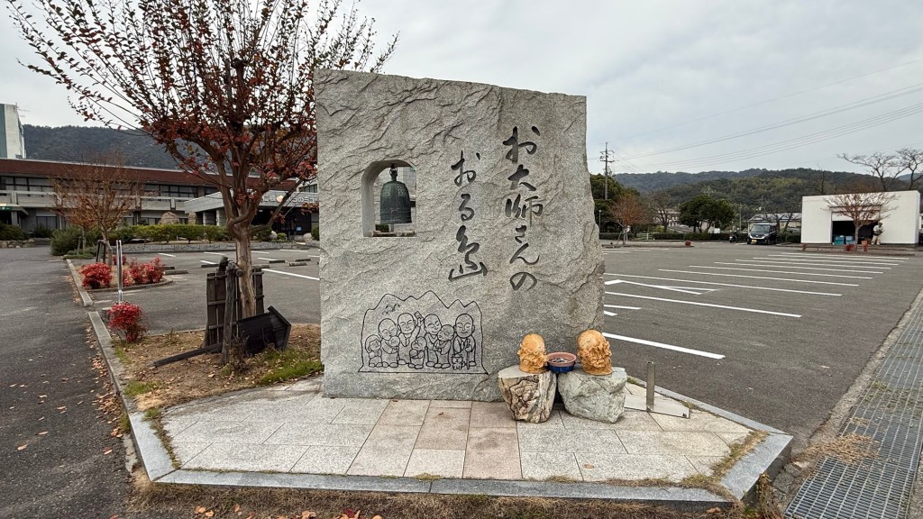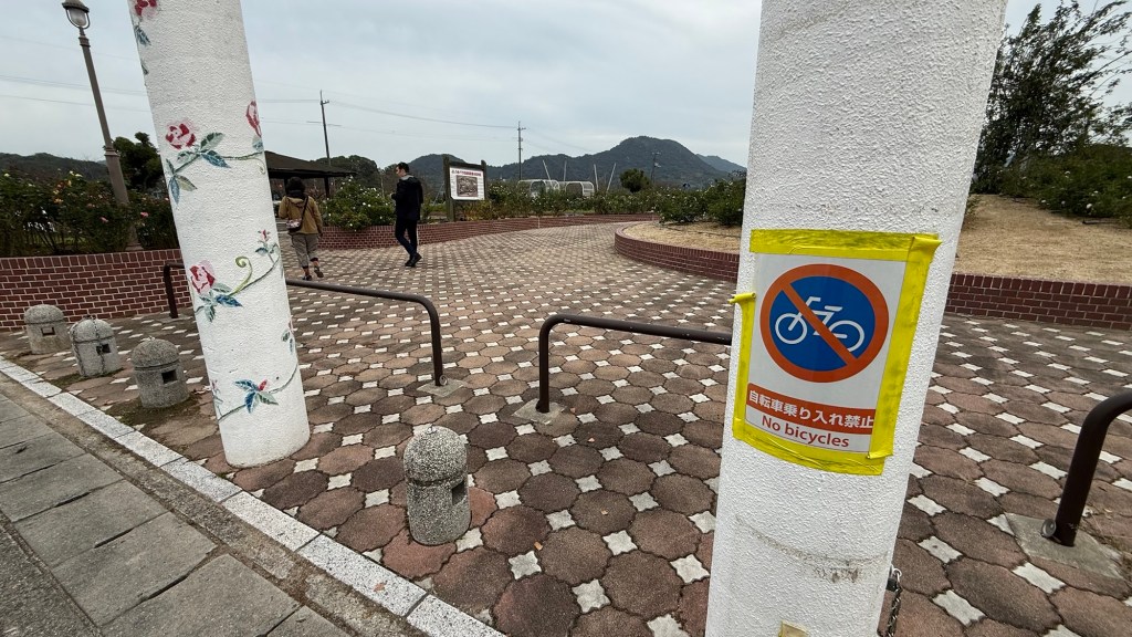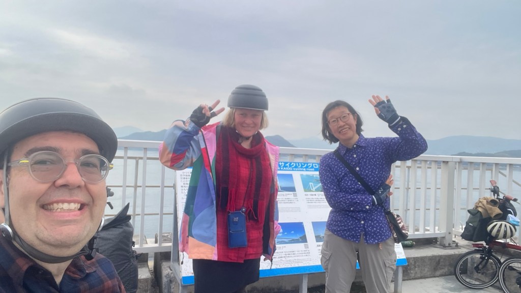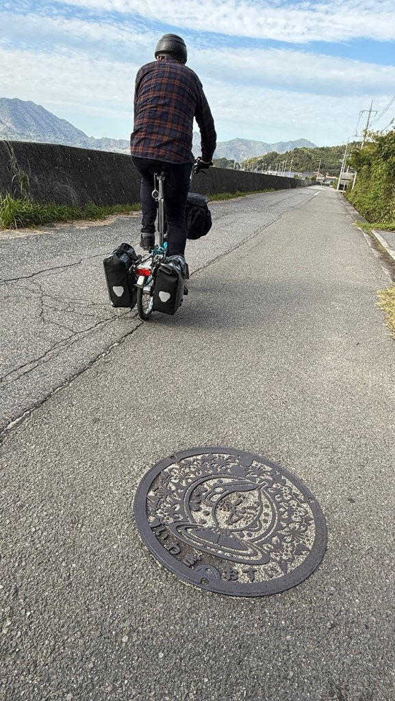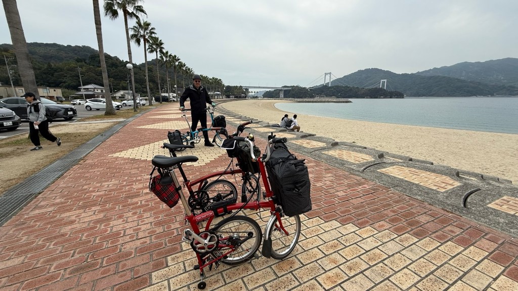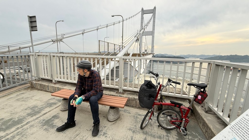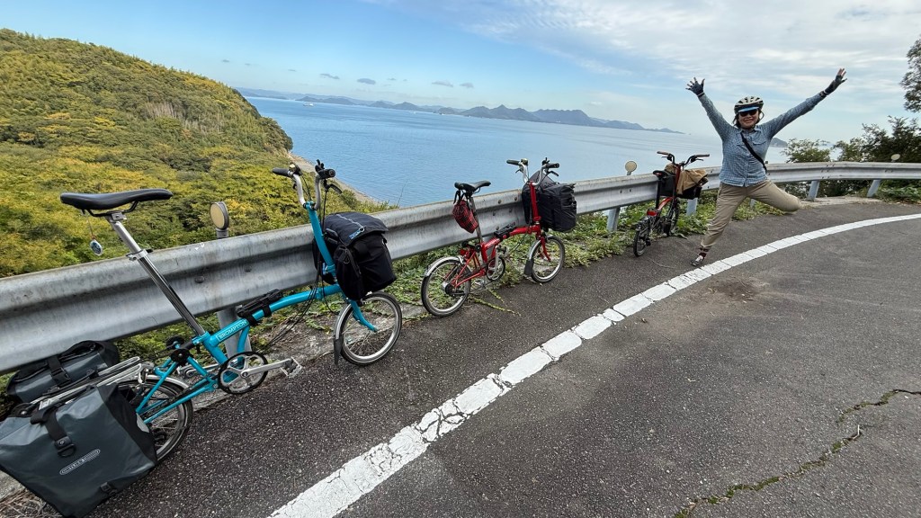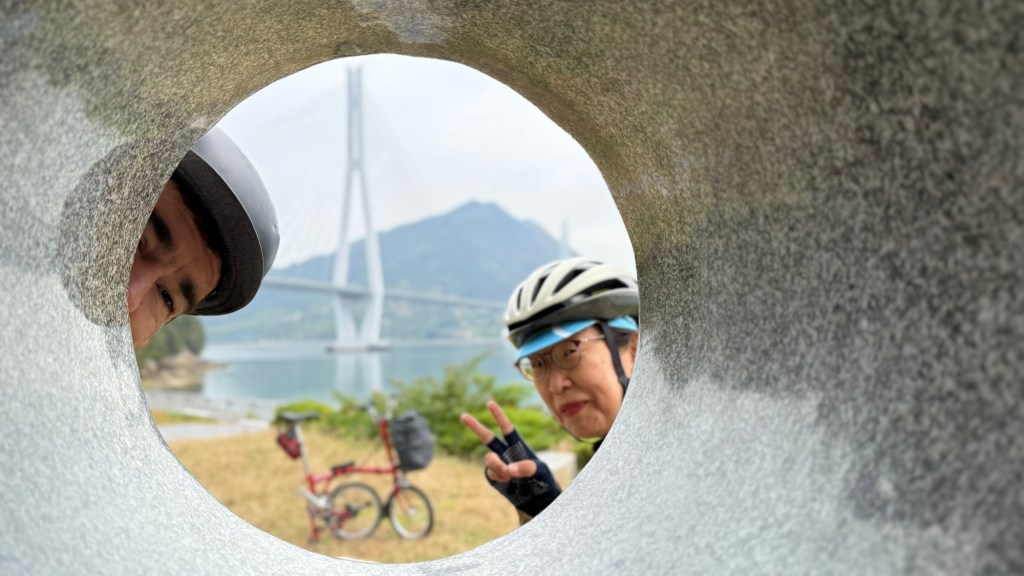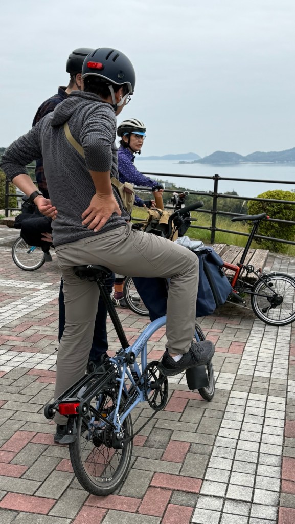 The bridges along the Shimanami Kaido are a wonderous thing. The approaching angles are really good for cyclists… even if you don’t have a battery, if you can’t cycle there is always walking. At the first lookout point of the bridge we came another Brompton rider from Korea who had cycled from Fukuoka… wow! Then we headed over the bridge, with a brief stop to scare away the dragons and on to the Ehime prefecture.