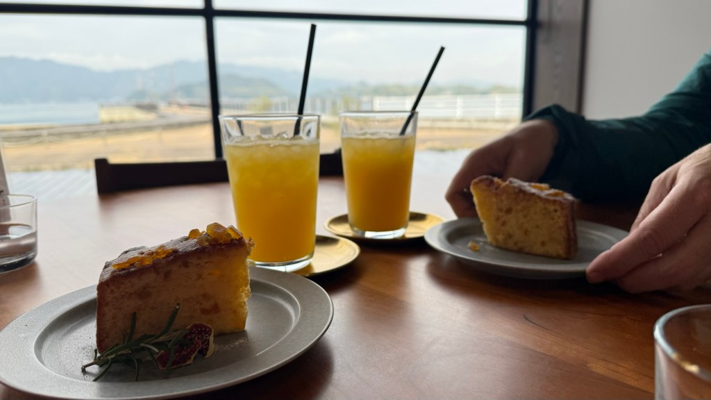On the other side of the bridge is the cyclist rest stop (also highway stop for cars) which has a wide range of produce from the region. As a cyclist you can pick up a wide range of “shiminami gear” and take a break. We enjoyed mochi and mandarin juice – mum it reminded me of your mandarins!